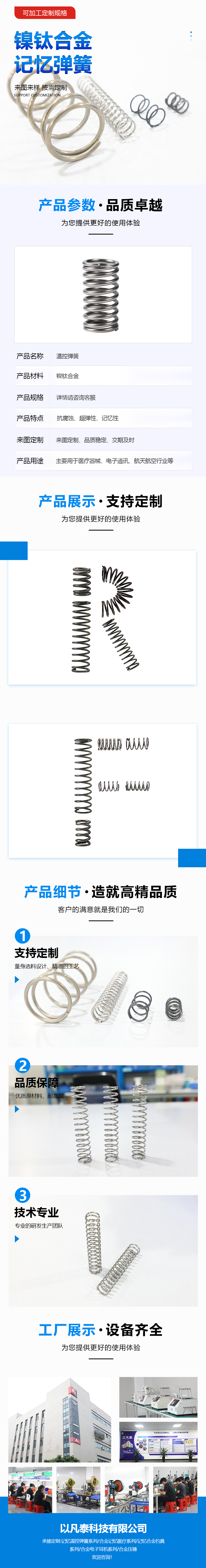 温控系列产品主要有镍钛形状记忆合金温控弹簧,其被广泛应用于:防潮箱,热水器,温控龙头,地暖控制阀门,消防系统等。利用其独特的形状记忆功能,可在不同的水温下发生不同的变化,被广泛应用到人们的家居生活中,比如它可以控制浴室水管的水温,在热水温度过高时通过\"记忆\"功能,调节或关闭供水管道,避免烫伤。也可以制作成消防报警装置及电器设备的安保装置,当发生火灾时,记忆合金制成的弹簧发生形变,启动消防报警装置,达到报警的目的。还可以把用记忆合金制成的弹簧放在暖气的阀门内,用以保持暖房的温度,当温度过低或过高时,自动开启或关闭暖气的阀门等等。记忆弹簧有使用寿命长,不腐蚀,不生锈,无磁等特性。