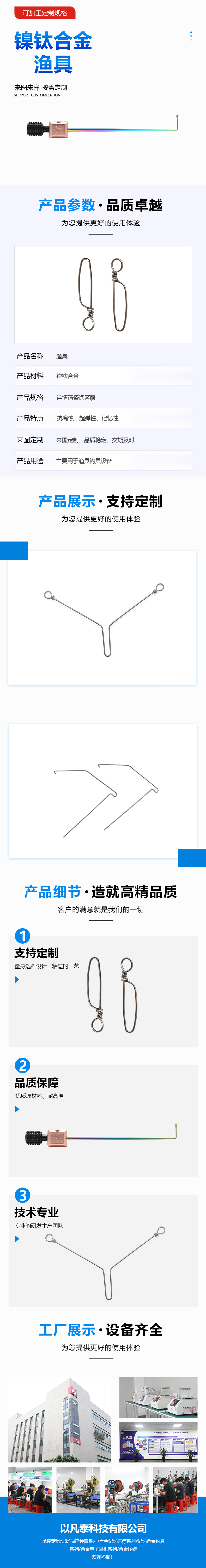 形状记忆合金钛合金弹簧应用到垂钓系列主要有垂钓支架、八字环链接器、鱼锁、防缠绕串钩、快速子线夹。使用超弹性NITI金属丝做镍钛合金支架是形状记忆合金的另一个应用,过去使用不锈钢金属丝,由于弯曲常常出现损坏问题,现在使用NITI形状记忆合金,具有高抗破坏性,抗腐蚀,不生锈,且可以反复使用,现已成为垂钓行业主要的应用材料。